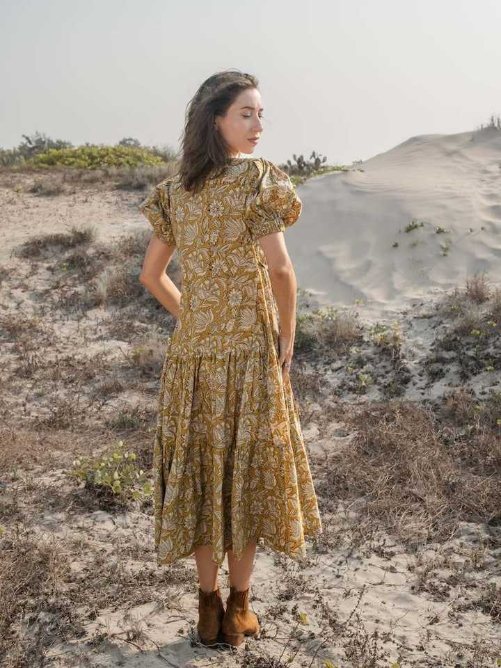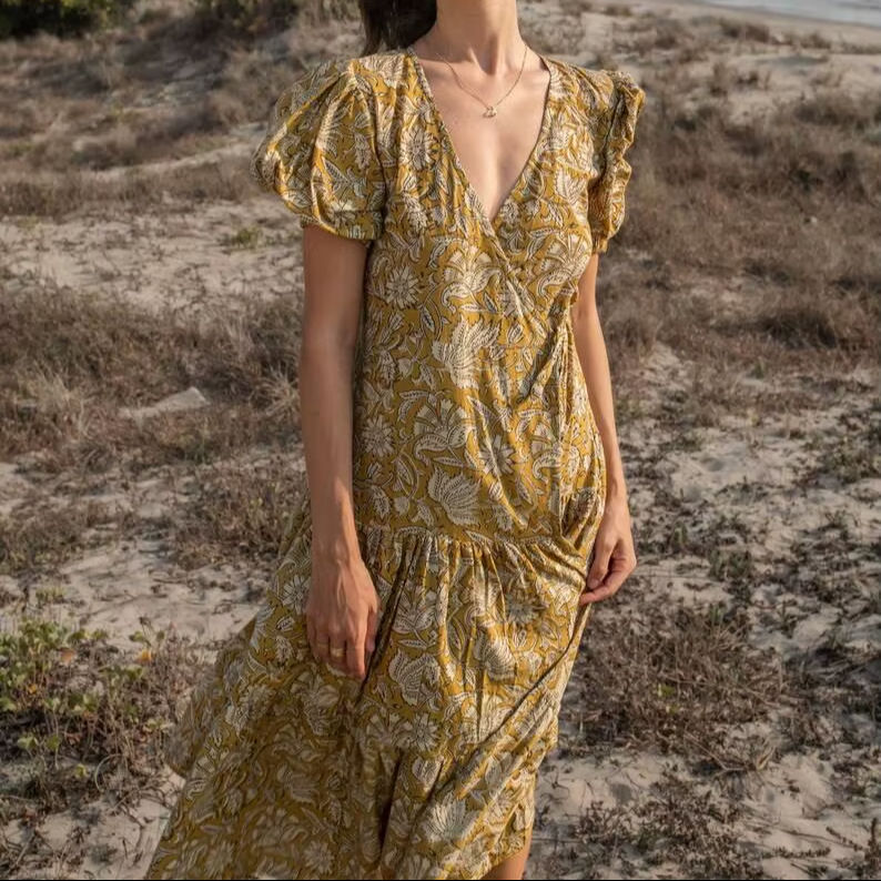 Summer Cotton Wrap Dress Tiered Boho Hand Block Print Maxi Midi Dress Comfortable Elegant Outfit Wedding Honeymoon Wear