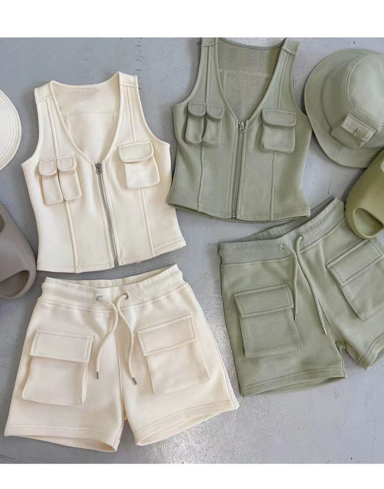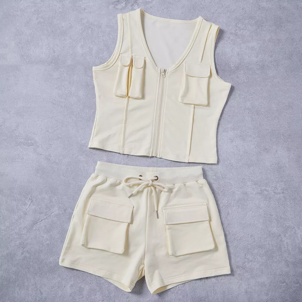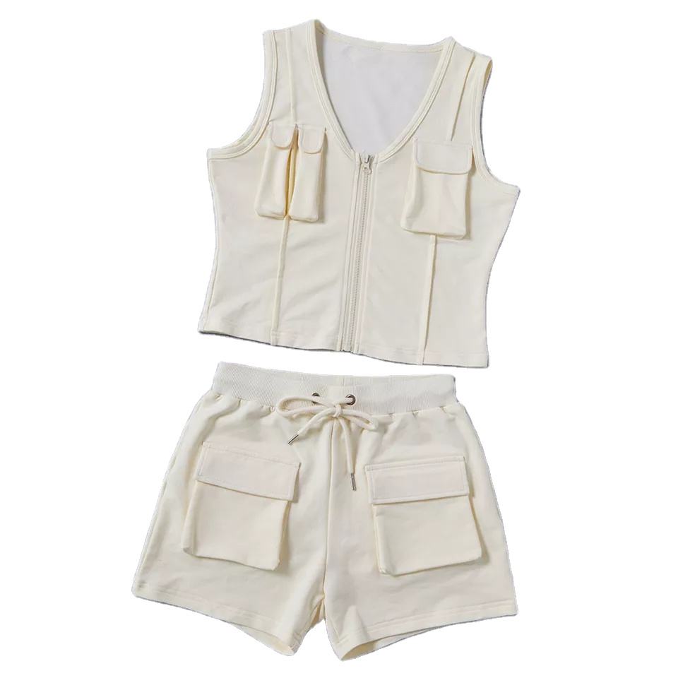 Summer Custom Jogger Set Womens French Terry Sleeveless Zip up Jacket Cargo Sweat Shorts 3d Pockets 2 Piece Women Short Set
