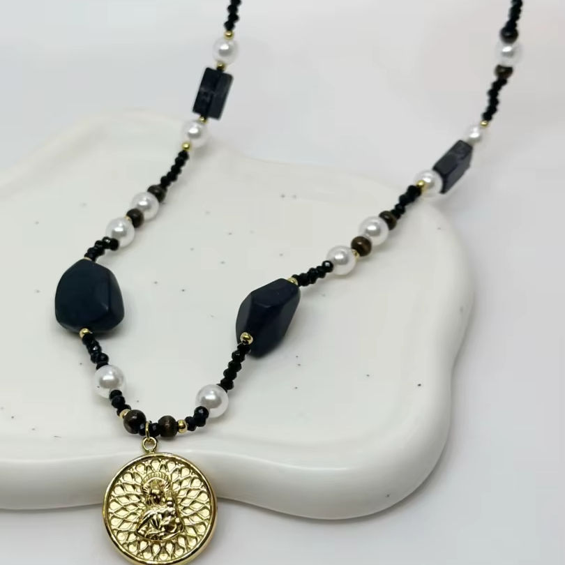 Summer Essential MOONRIVER Women's Stainless Steel Fashion Choker Simple Style Black Bead Pearl Copper Religious Necklace