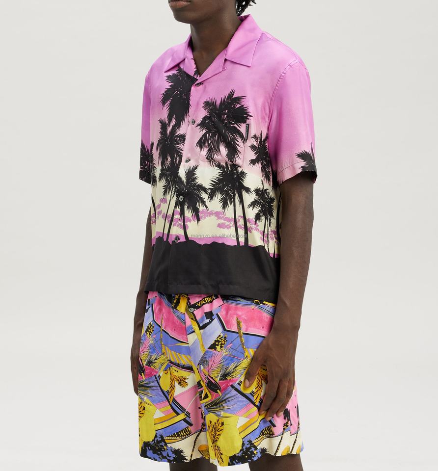 Summer Fashion Men's Coconut Tree Print Satin Hawaiian Shirts Loose Linen Ringer Short-Sleeved Beach Tops Street Casual Men