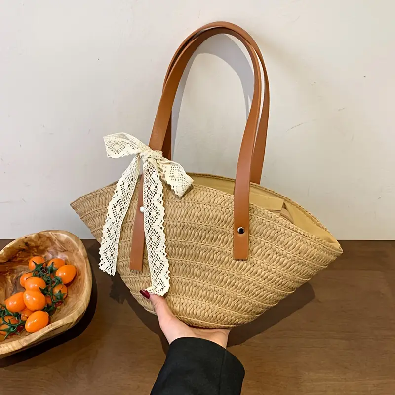 Summer Hand Straw Woven Bags for Women Vintage Handbag Rattan Vacation Beach Shoulder Bag Shopping Bag Basket