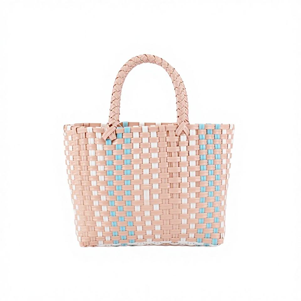 Summer Macaron Color Contrast Handmade PVC Woven Two Handles Open Closure Fashion Beach Travel Hand Square Bag for Kids Tanjing