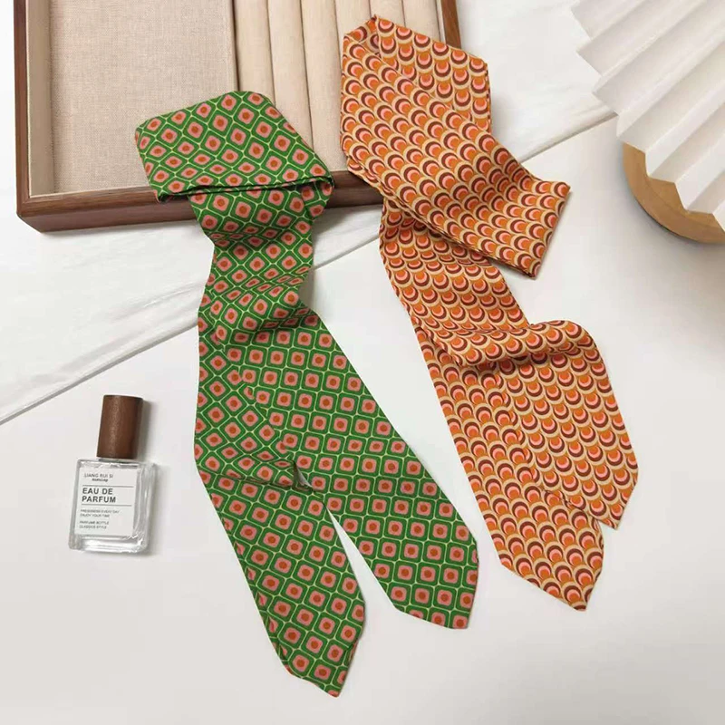 Summer Multi Color Geometry Pattern Skinny Silk Scarf for Women Hair Strip Silk Ribbon Lady Small Neck Scarves Bag Handle Ribbon