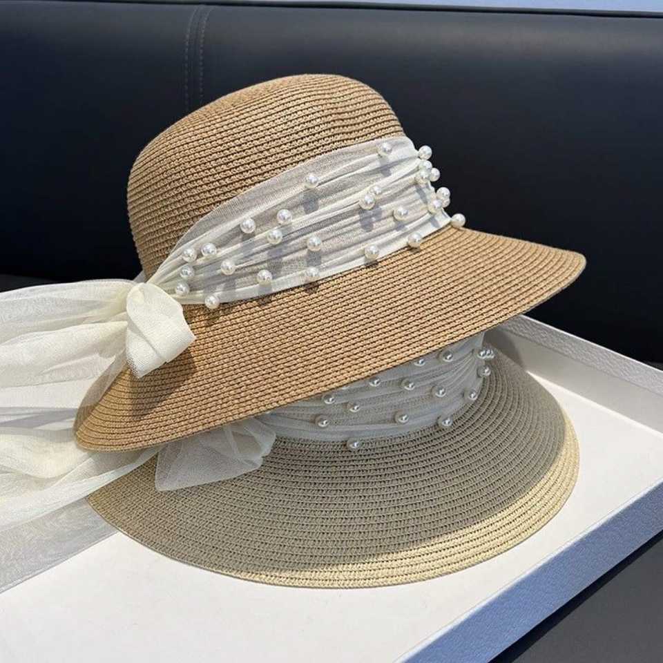 Summer New Pearl Mesh Sunshade Straw Character Woven Lace Travel Female Bowknot Bucket Hat Wholesale
