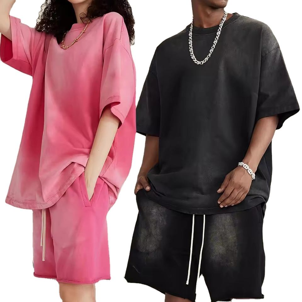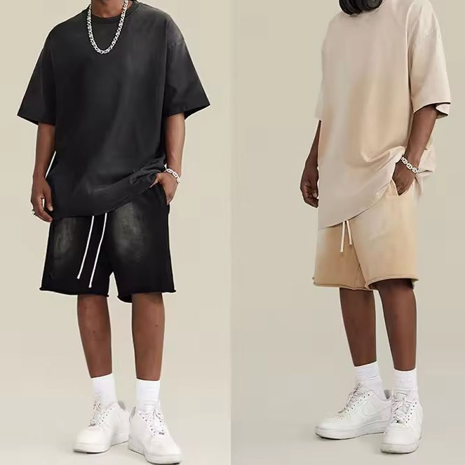 Summer Oversize Acid Washed Cotton Sweat Shorts and Shirts Set Men High Quality Short Tracksuit Men Shorts Set Cotton Breathable
