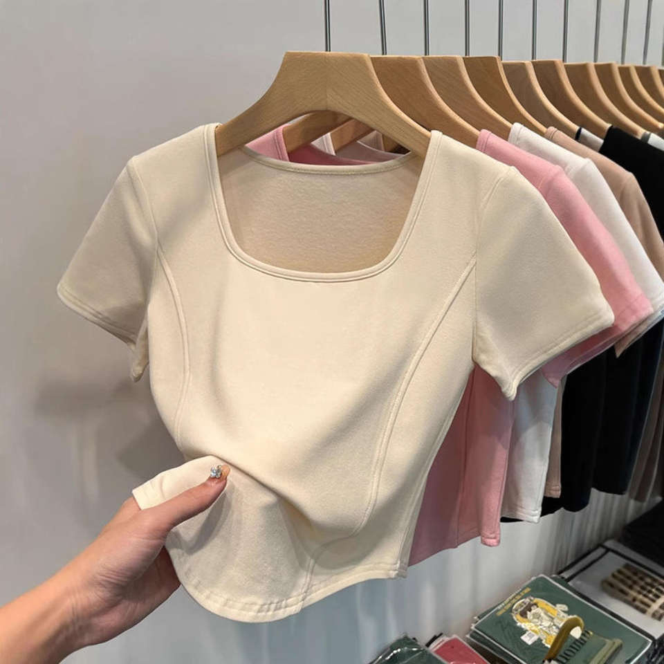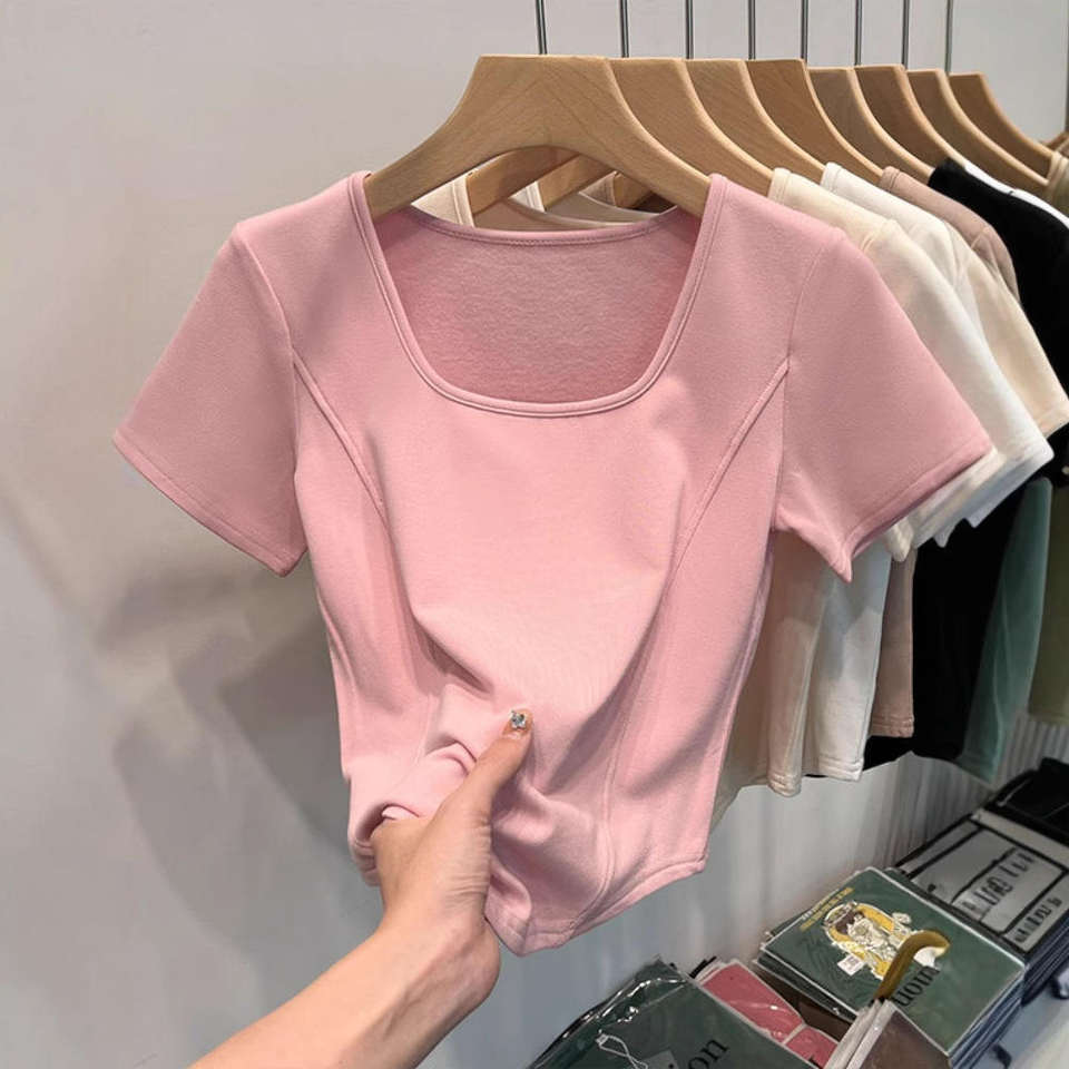 Summer Square Neck Short-Sleeved T-Shirt White Curved Hem Large Neckline Slim Fit Fishbone Top Plain Dyed Solid Long
