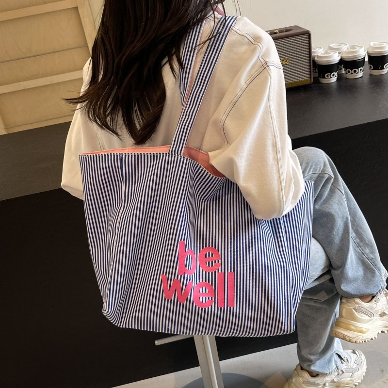 Summer Striped Large Cotton Tote Shoulder Bag Customized Logo Contrast Color Canvas Grocery Bag Reversible Striped Beach Bag