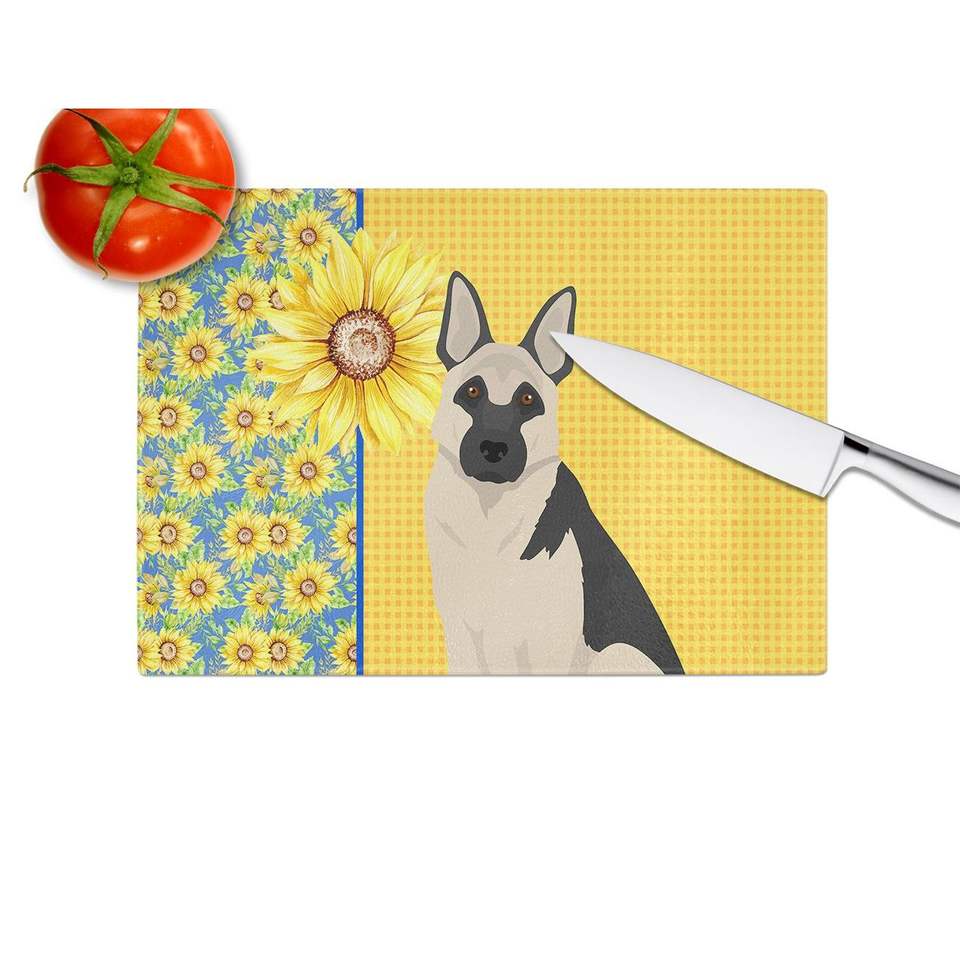 Summer Sunflowers German Shepherd Cutting Board Black Silver Decorative Tempered Glass Large Size Kitchen Serving Board for