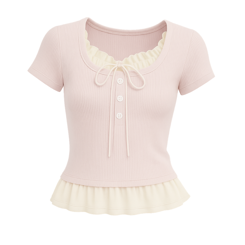 Summer Sweet Breathable Lace Knit Top for Women Pink Ruffled Collar Short Sleeve Soft Ribbed Fabric Regular Length
