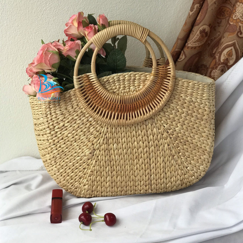 Summer Vintage Style Straw Basket Bag Handwoven Water Hyacinth with Rattan Handle and Feathers/Bow Decoration Two Straps
