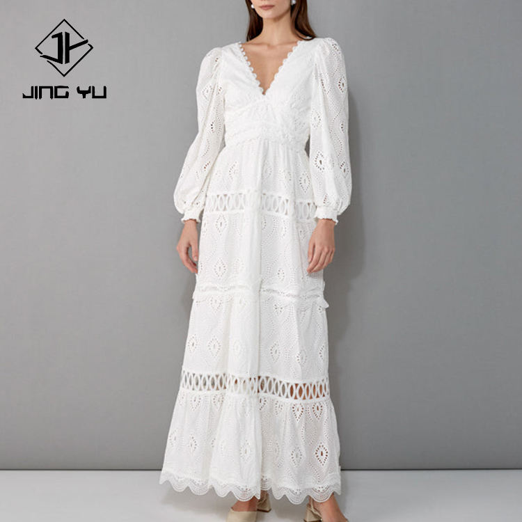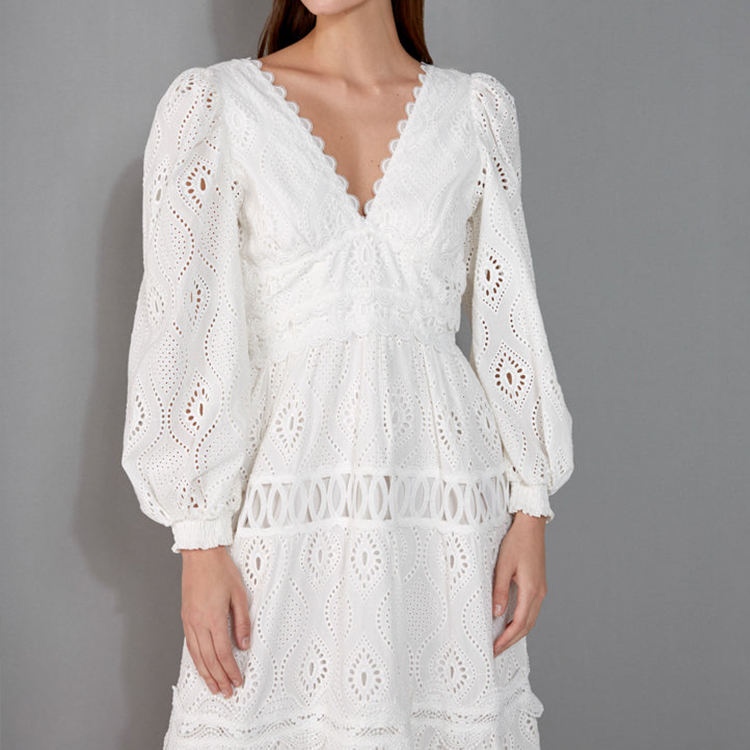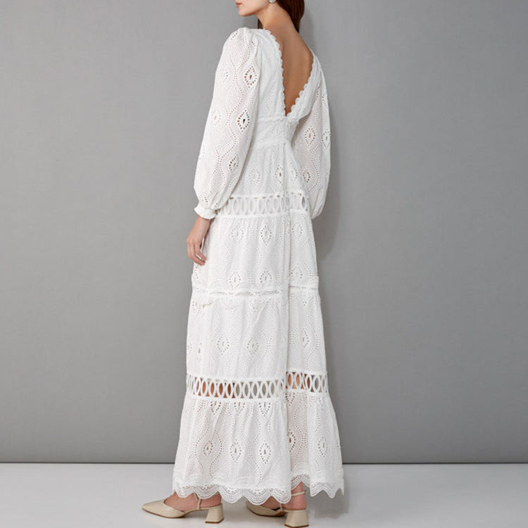 Summer White Multi-Layer Deep V-Neck Bubble Long Sleeve Embroidered Hollow-Out Maxi Dress Custom Cotton Embroidery Dress
