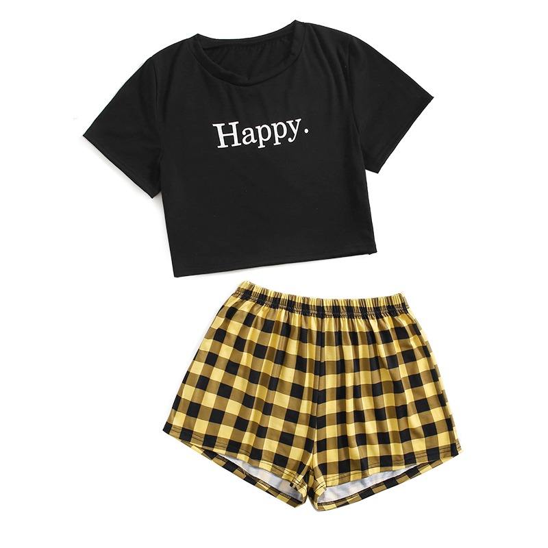Summer Women's Plus Size Embroidered Pajamas Set Hipster Pants Suit Black T-shirt Short-Sleeved Printed Cotton with Shorts