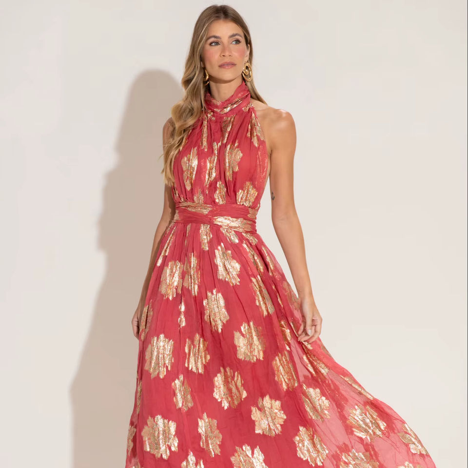 Summer Women's Sexy Halter Print Maxi Dress Elegant Ladies Long Maxi Dress for Cocktail Parties Oversized Floor-length Handmade