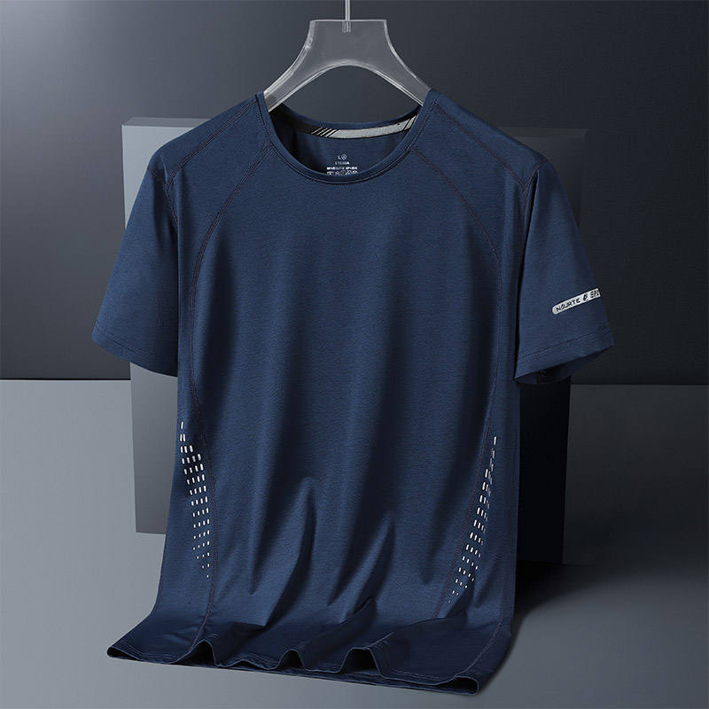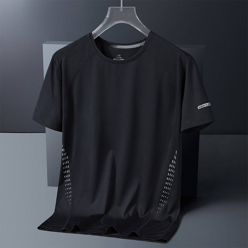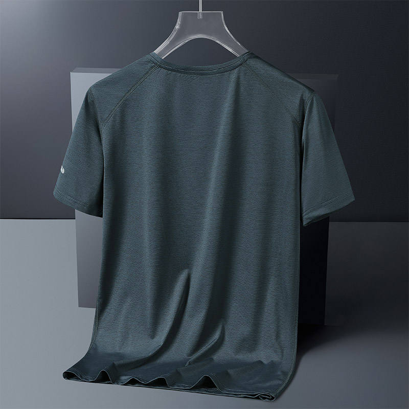 Summer New Sports Leisure Solid Canvas Short Sleeve T-Shirt Men Breathable Neck Comfort Ice Silk Elastic Increase Size