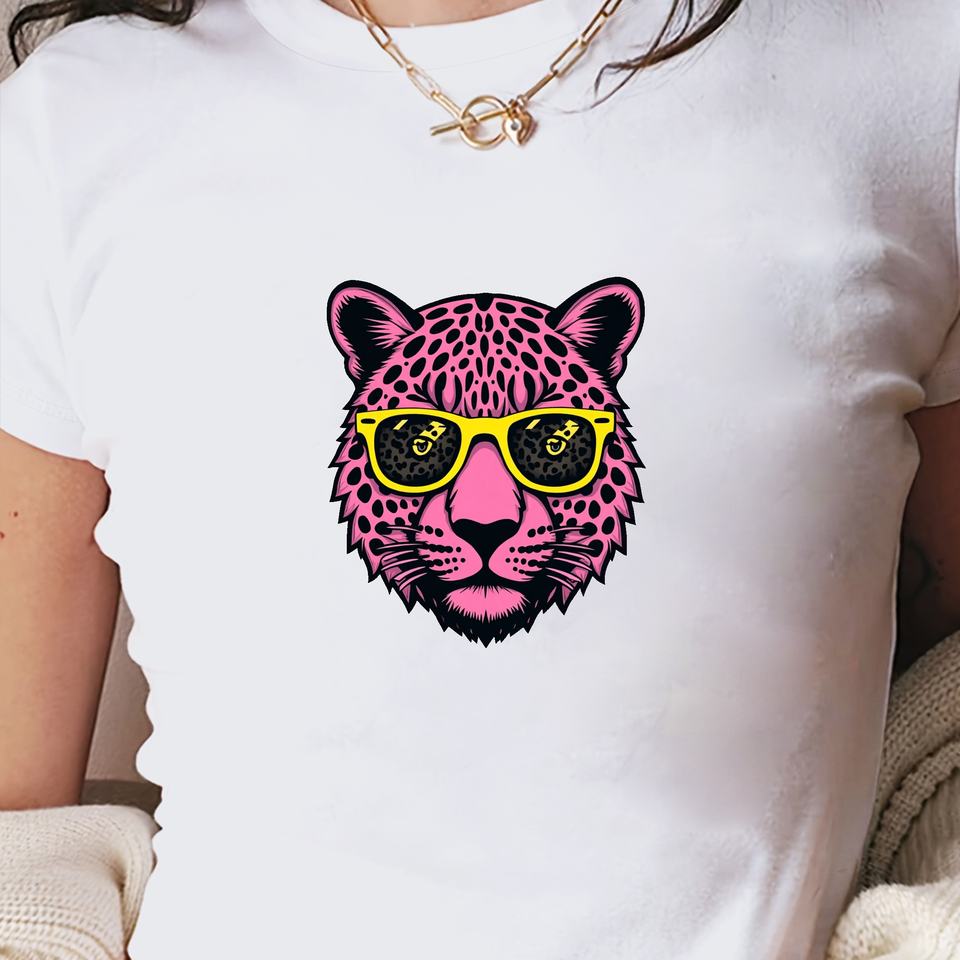 Sunglasses Stylized pink leopard head women's fashion short t-shirt