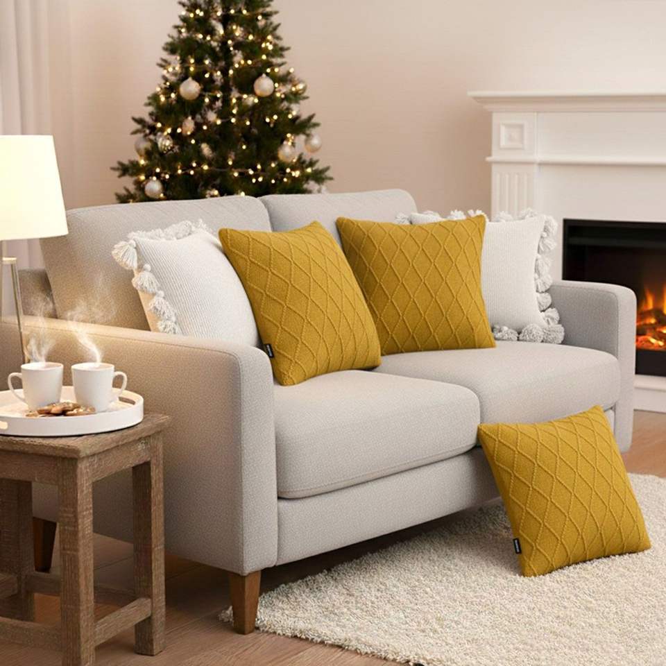 Sunshine Yellow Diamond Knit and White Pom-Pom Pillowcase Set 5PC Bright Sofa and Bed Decorative Covers