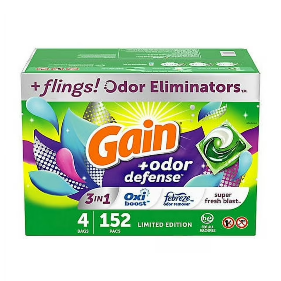 Super Fresh Blast Scent 3-in-1 Laundry Detergent Pacs 152 Count-Gain Flings Odor Defense Lavender Perfume Softener Solid Shape