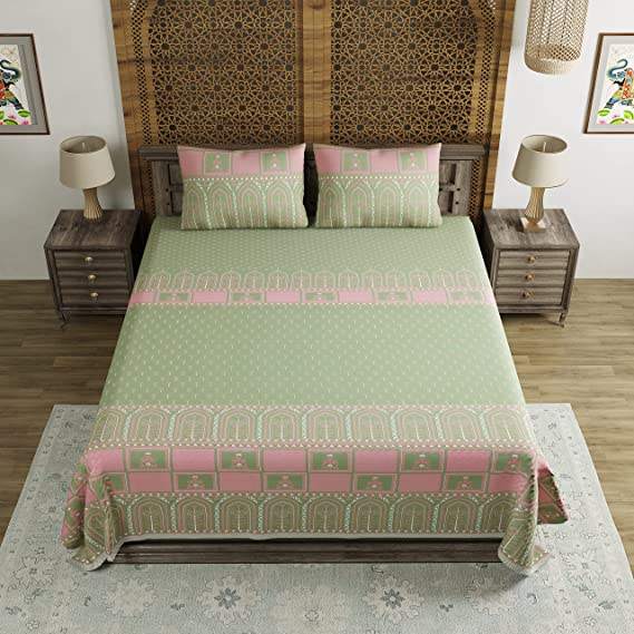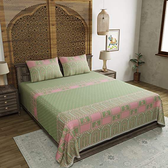 Super King Size Pure Cotton Hand Block Print Bedsheet Discharge Green-Premium Fitted & Flat Sheets