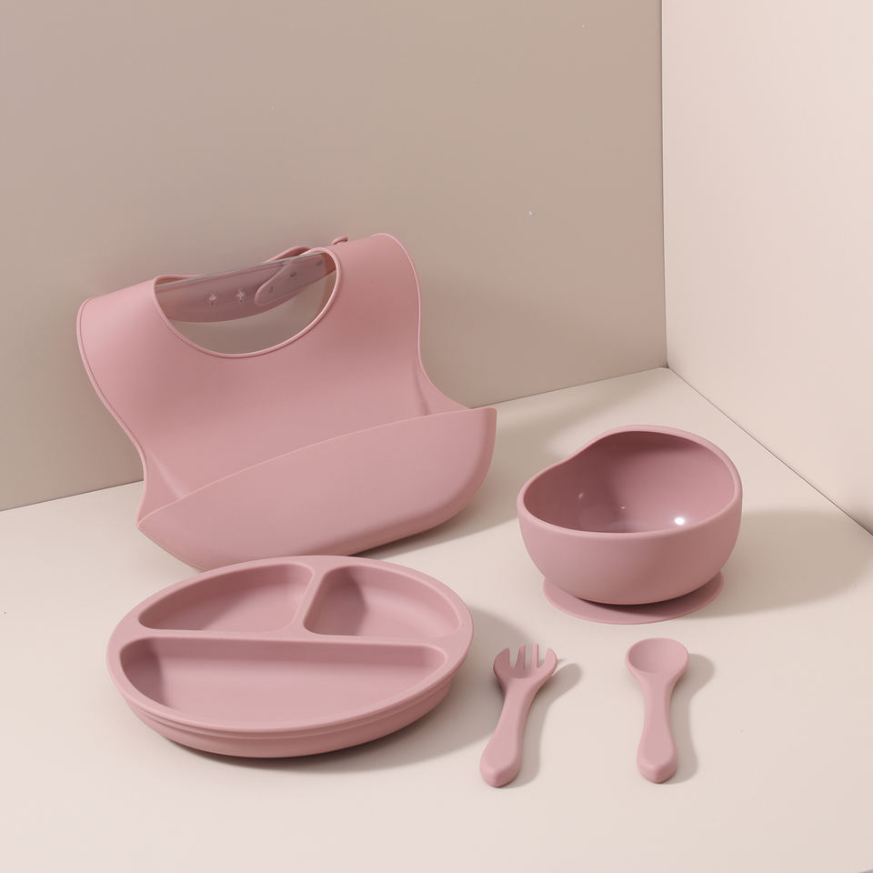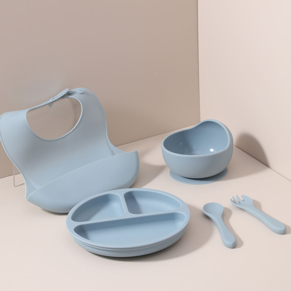 Super Quality Silicone Baby Feeding Set Baby Led Weaning Set Suction Bowl Divided Plate Adjustable Bib Soft Spoon Fork