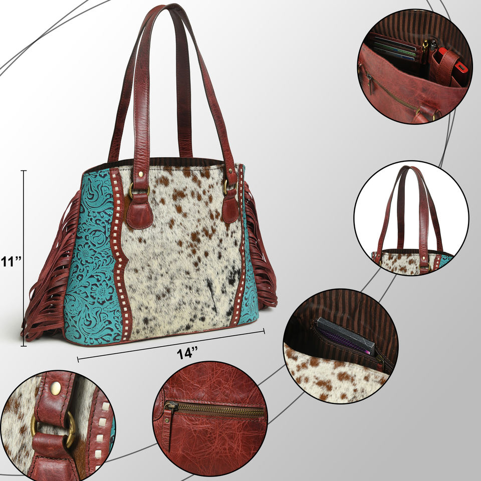 Content If Any:Embosed lower Print on leather with side fringe and raw hide brding
