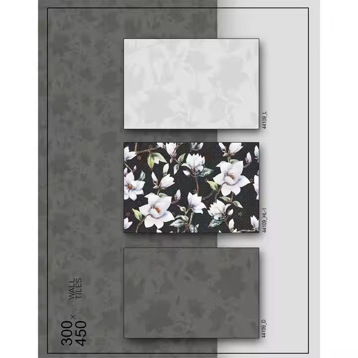 Superb Quality Black Flower Print Highlighter Digital Ceramic Wall Tiles Suitable for Interior Glossy Finish 300x450 30x45 12x18
