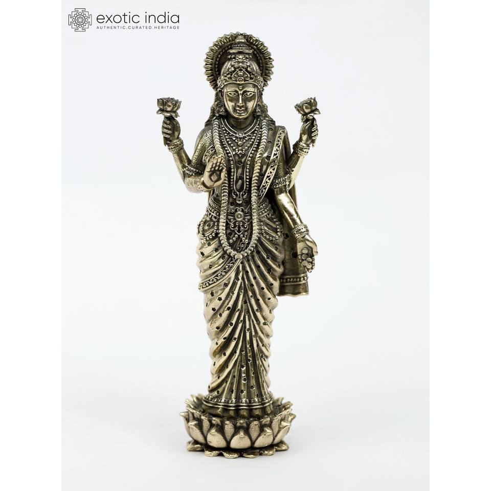 Exotic India Superfine Brass Four-Armed Goddess Lakshmi Statue Standing Lotus Sculpture Idol Available in Different Sizes India
