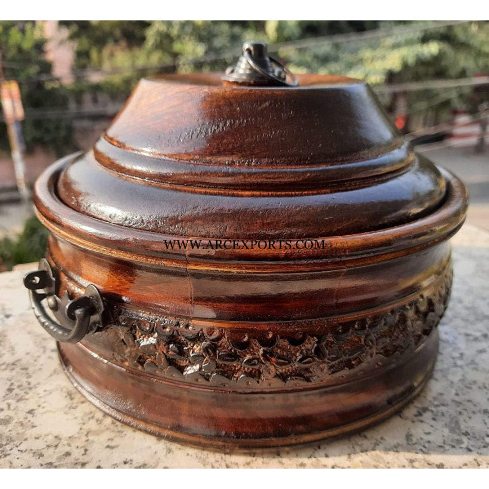Superior Quality Acacia Wood Roti Casserole Box With Enamel Work Wooden Lid Hot Pot Kitchen Accessories Dining Table Chapati Box