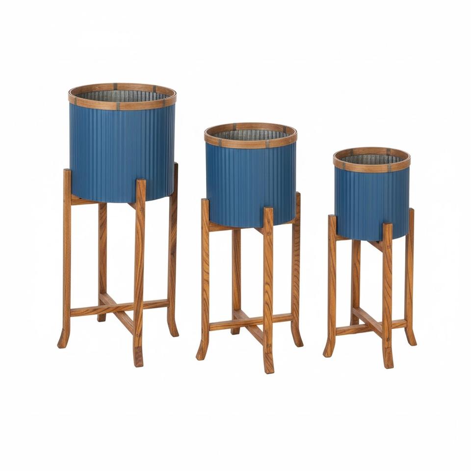 Superior Quality Blue Color Metal Planters With Wood Stands Modern Home Decor Plant Pots For Indoor And Outdoor Use Low Price
