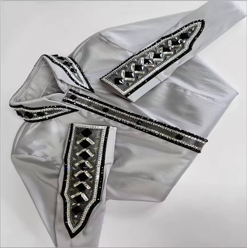 Superior Western Show Shirt Iridescent Taffeta Gray Black White Crystal Stone Detail Hidden Zipper on Collar and Arm Sleeves