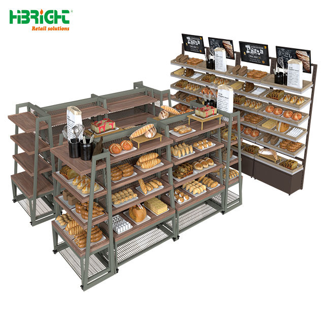 Supermarket Equipment Heavy-Duty Double-Sided Wall Gondola with Tempered Glass Side Panel and Wooden Bakery Display Rack
