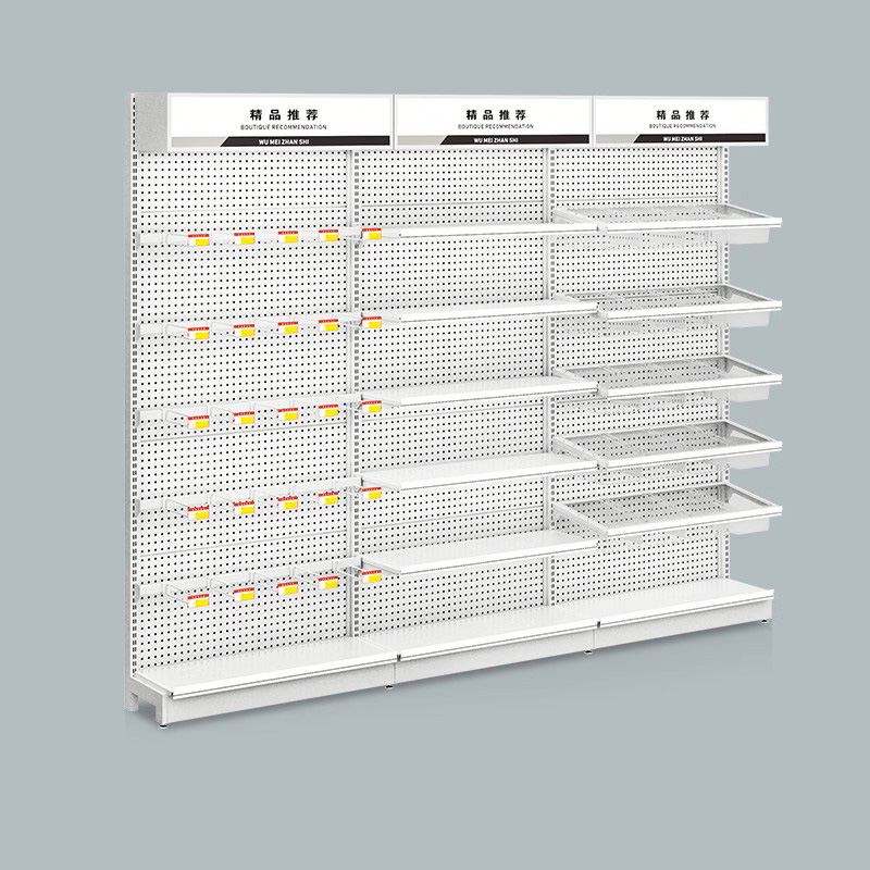 Supermarket Mall White Ceramic Floor Storage Shelf Beer Liquor Bottle Cigarette Metal Slatwall Display Shelf