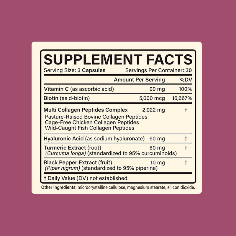 Vitamin C, Biotin, Multi Collagen Peptides Complex, Hyaluronic Acid, Turmeric Extract, Black Pepper ExtractMain Ingredient