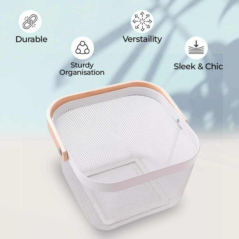 Supplies High Quality Metal Mesh Storage Basket with Wooden Handle for Fruit Vegetable and Kitchen Storage and Organization