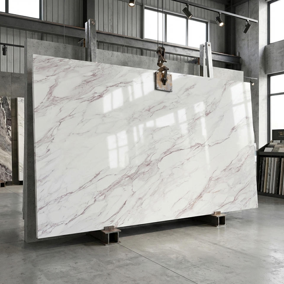 Supply Polished Calacatta Purple Printed Quartz Worktop Surface Artificial Stone Slab for Prefabricated Kitchen Island Project
