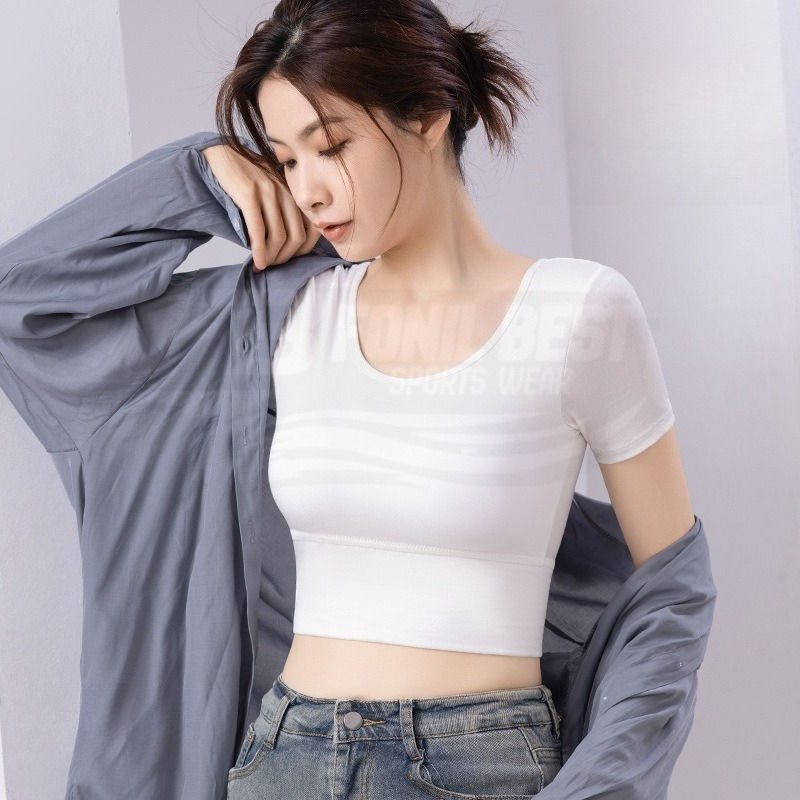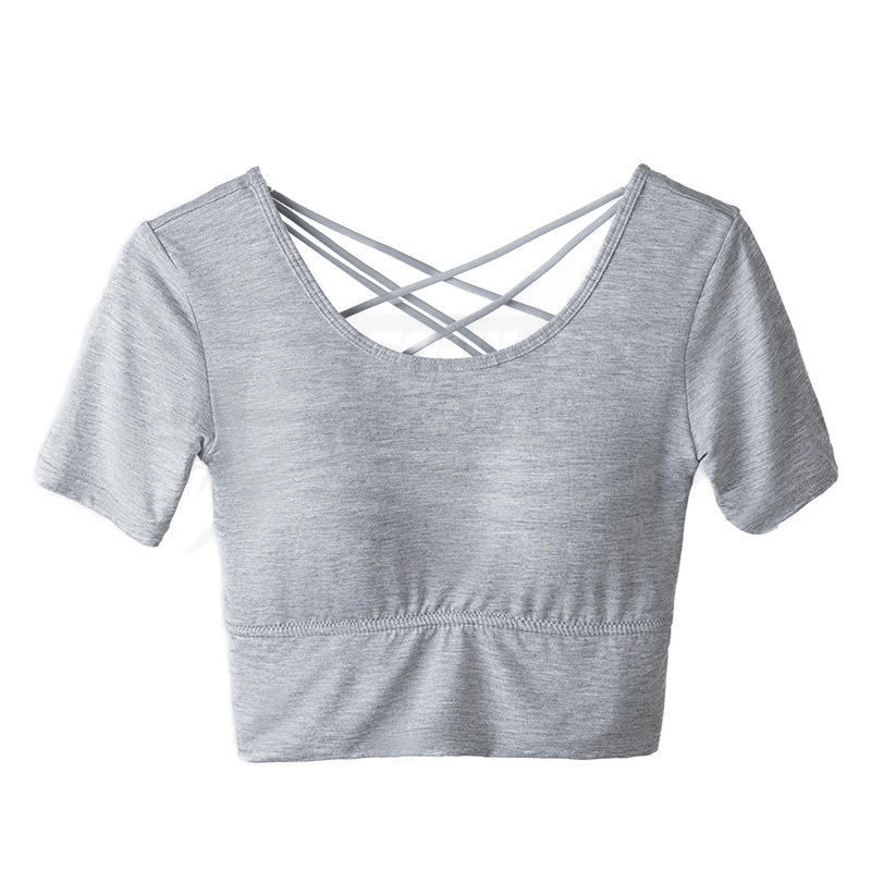 Support Custom Logo Front Cross Back Yoga Crop Top Women's Short Sleeve Breathable Built-in Bra Plus Size Quick Dry Activewear