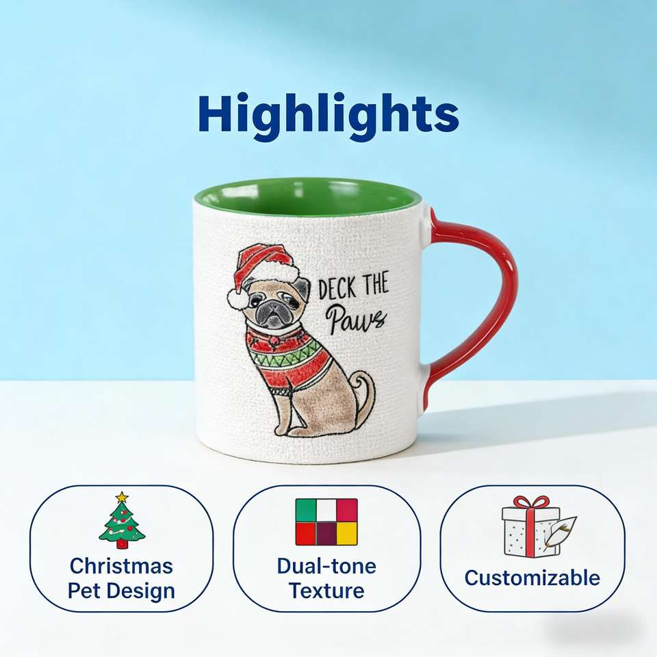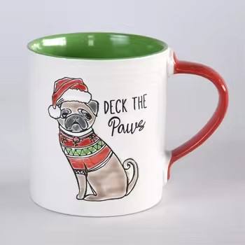 Support Customizing Cute Pug Mug Green Interior Red Handle Deck the Paws Print Festive Ceramic Coffee Mug for Christmas Gifting