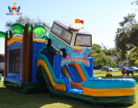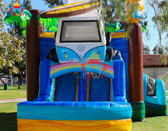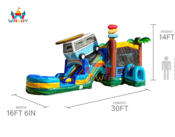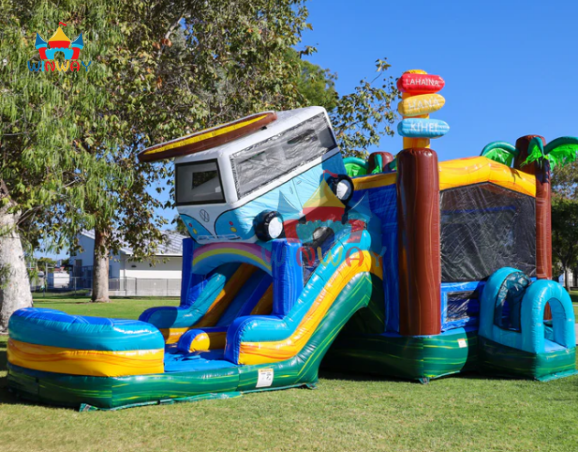 Surf Van Themed Inflatable Bounce House Combo, Tropical Palm Tree Inflatable Castle with Slide & Splash Pool for Outdoor Party