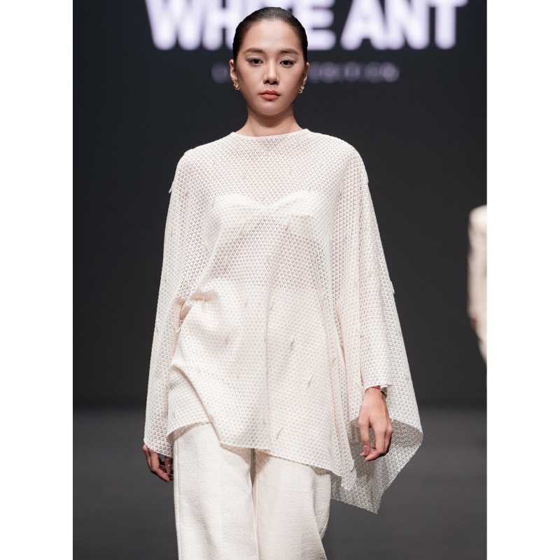 Sustainable Fashion Mesh Lace Cape With Round Neck ORAN EMB LACE CAPE Relief 64% Organic Cotton 36% Polyester WHITE ANT Vietnam