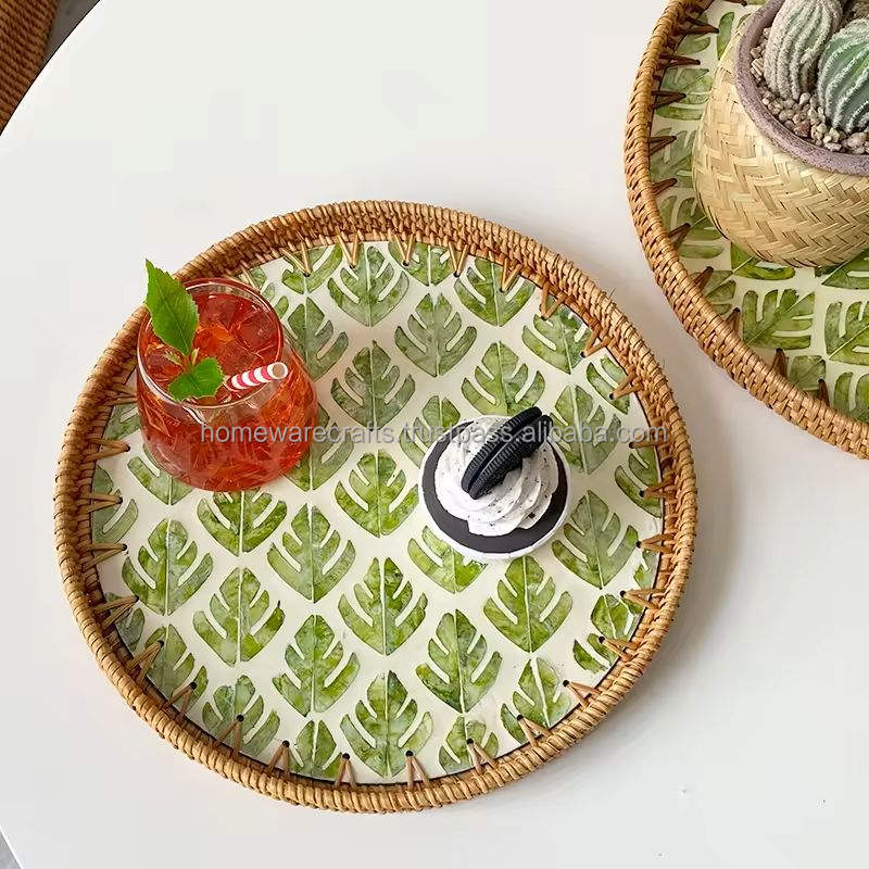 Sustainable Handmade Mother of Pearl Inlaid Rattan Food Serving Tray-Customizable Commercial Grade Decorative Tray From Vietnam