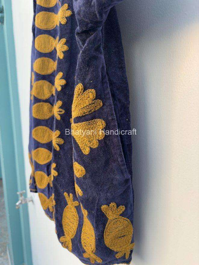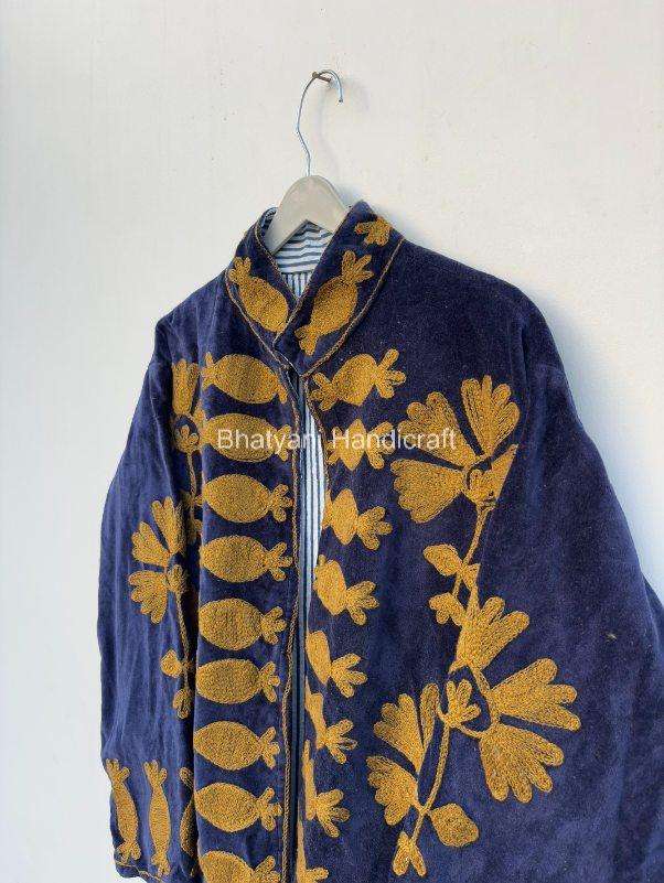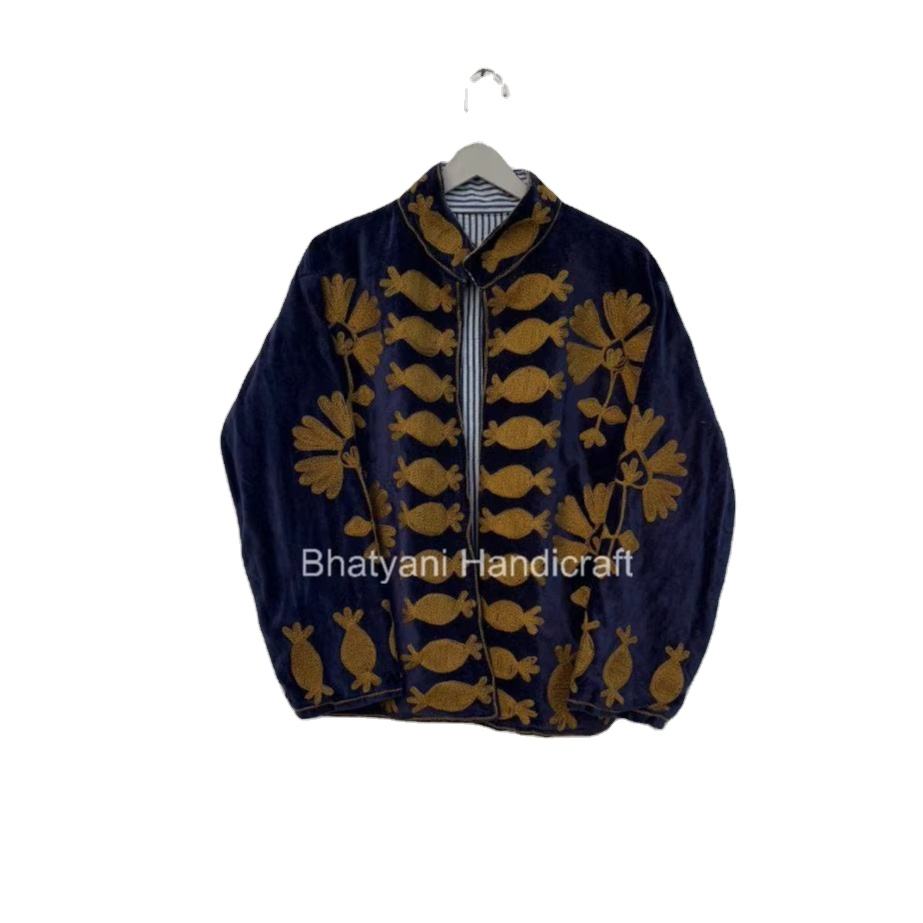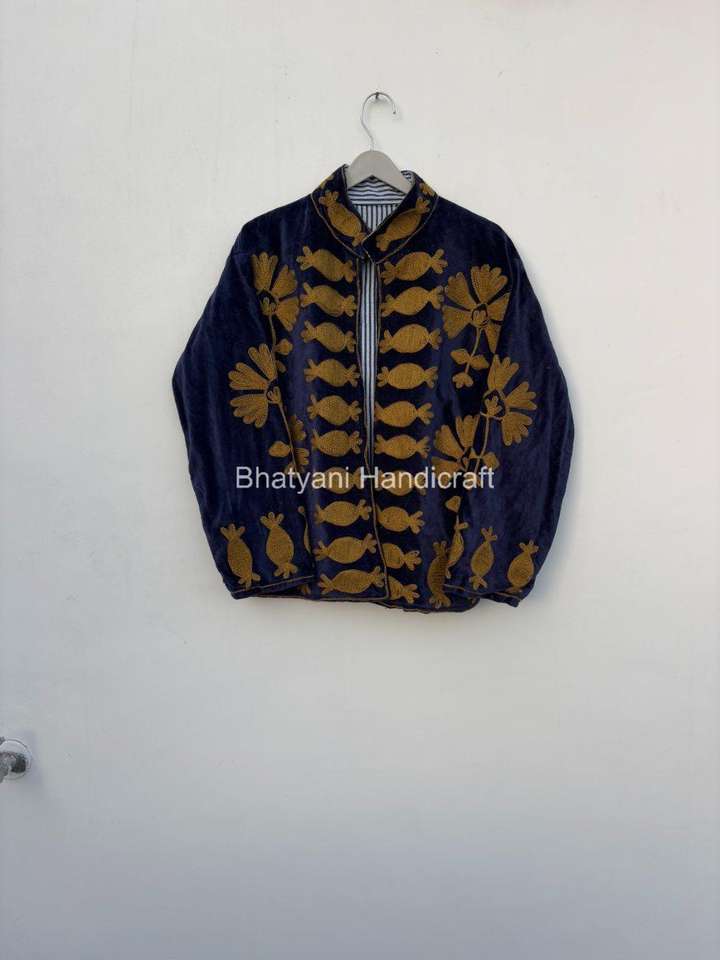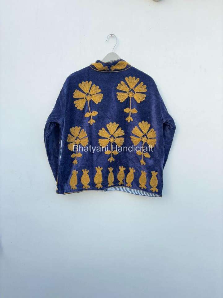 Suzani Embroidery Velvet Short Unisex Quilted Jacket with Cotton Filling Finished Gift for Party Wear