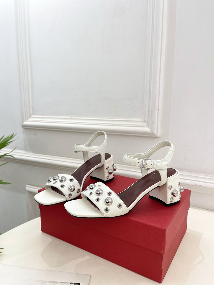 White Studded Block Heel Sandals with Ankle Strap Open Toe Casual Summer Shoes for Women
