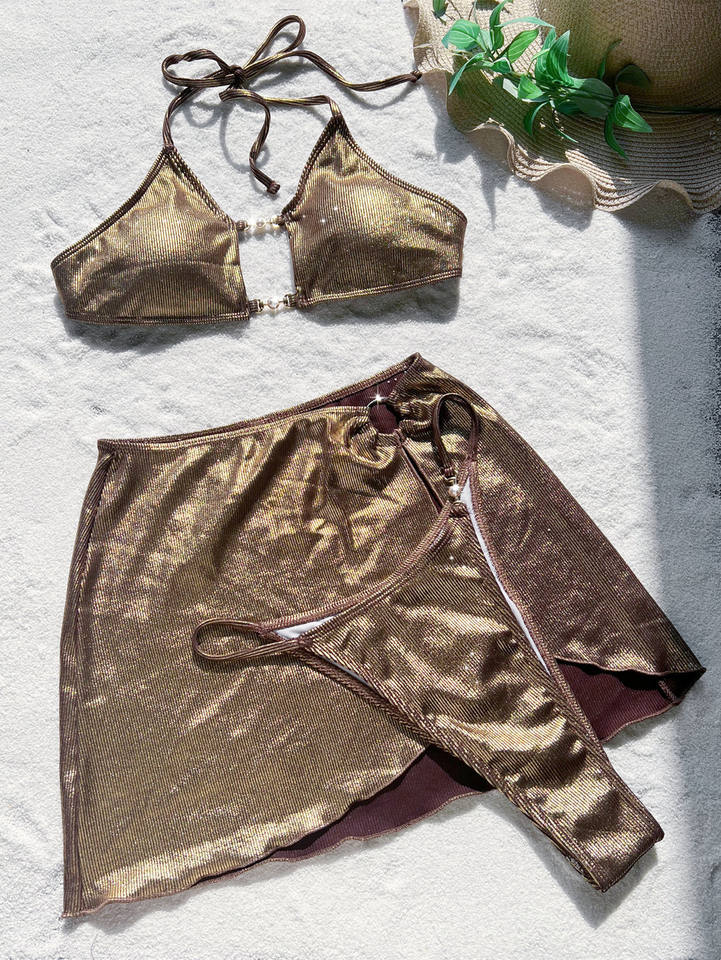 Women's High Waist V-Neck 3-Piece Bikini Set Customized Sexy Beach Swimwear Quick-Dry Removable Padded Eco-Friendly