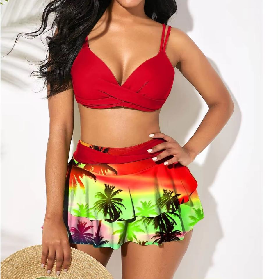 Women's Coconut Tree Print High Waist Swimwear Best Design Two-Piece Beachwear XS Size Factory Service Bra Style Swimming Suit