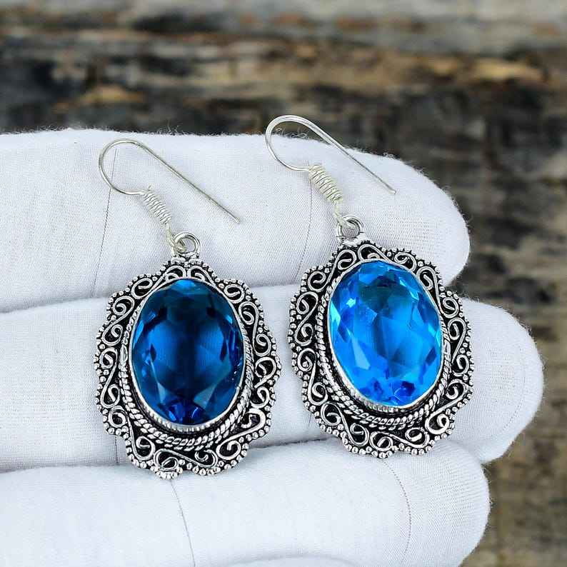 Swiss Blue Topaz 925 Sterling Silver Earrings Handmade Gemstone Jewelry Antique Fine Earrings Gift For Women