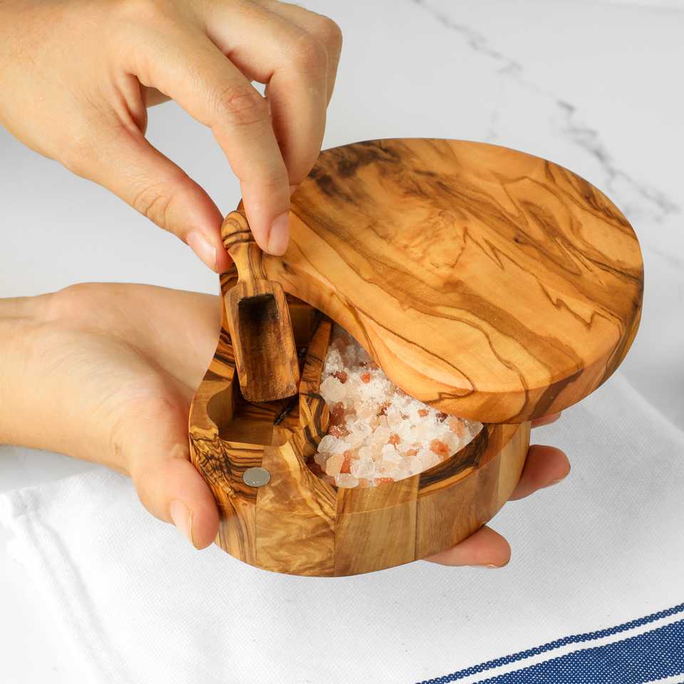 ArtisRaw Olive Wood Salt Cellar with Swivel Lid and Adjustable Cover for Kitchen Storage