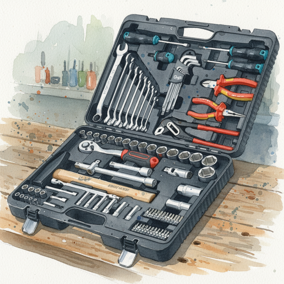 hex keys, extension bar, ratchet handle, universal joints, SPARK PLUG, Pliers, combination wrench, Socket, deep socket, sliding head, wrenchtool includes