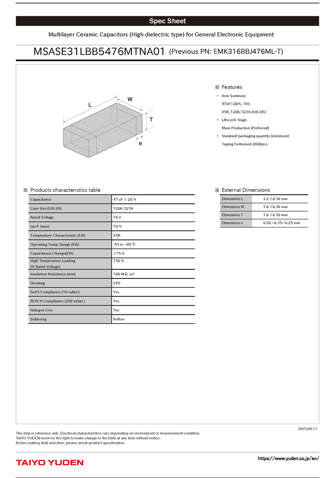 TAIYO YUDEN MLCC Multilayer ceramic capacitor 1206/3216 MSASE31LBB5476MTNA01 EMK316BBJ476ML-T SMT X5R 16V 47UF ±20%