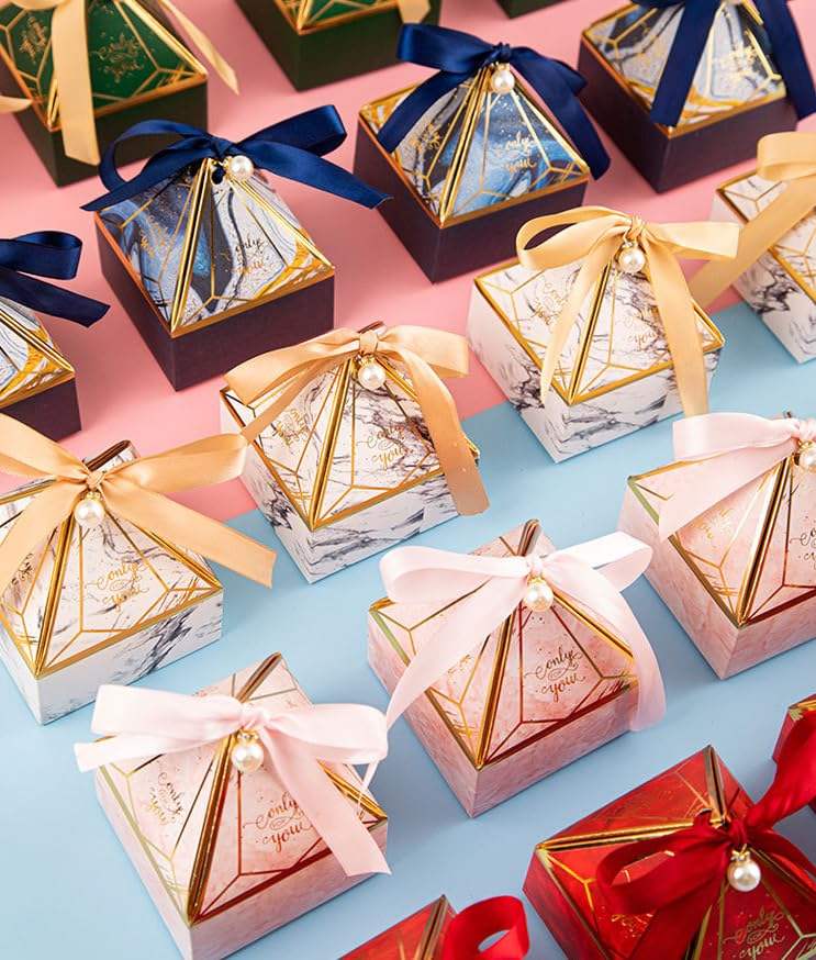 TH CBB-452 Luxury Pyramid Gift Box with Ribbon Bow and Pearl Charm for Wedding, Party Favors, and Jewelry Packaging
