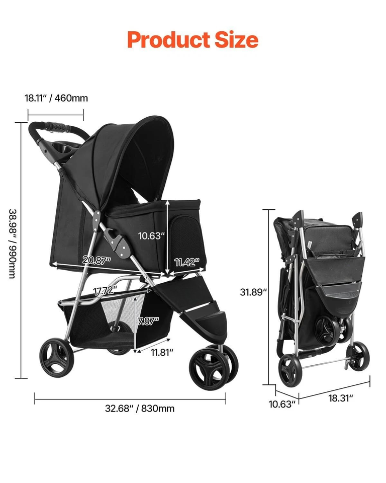 TH-PPS-547 Durable Three Wheel Foldable Pet Stroller Adjustable Canopy Oxford Fabric Mesh Windows Spacious Cabin for Pets