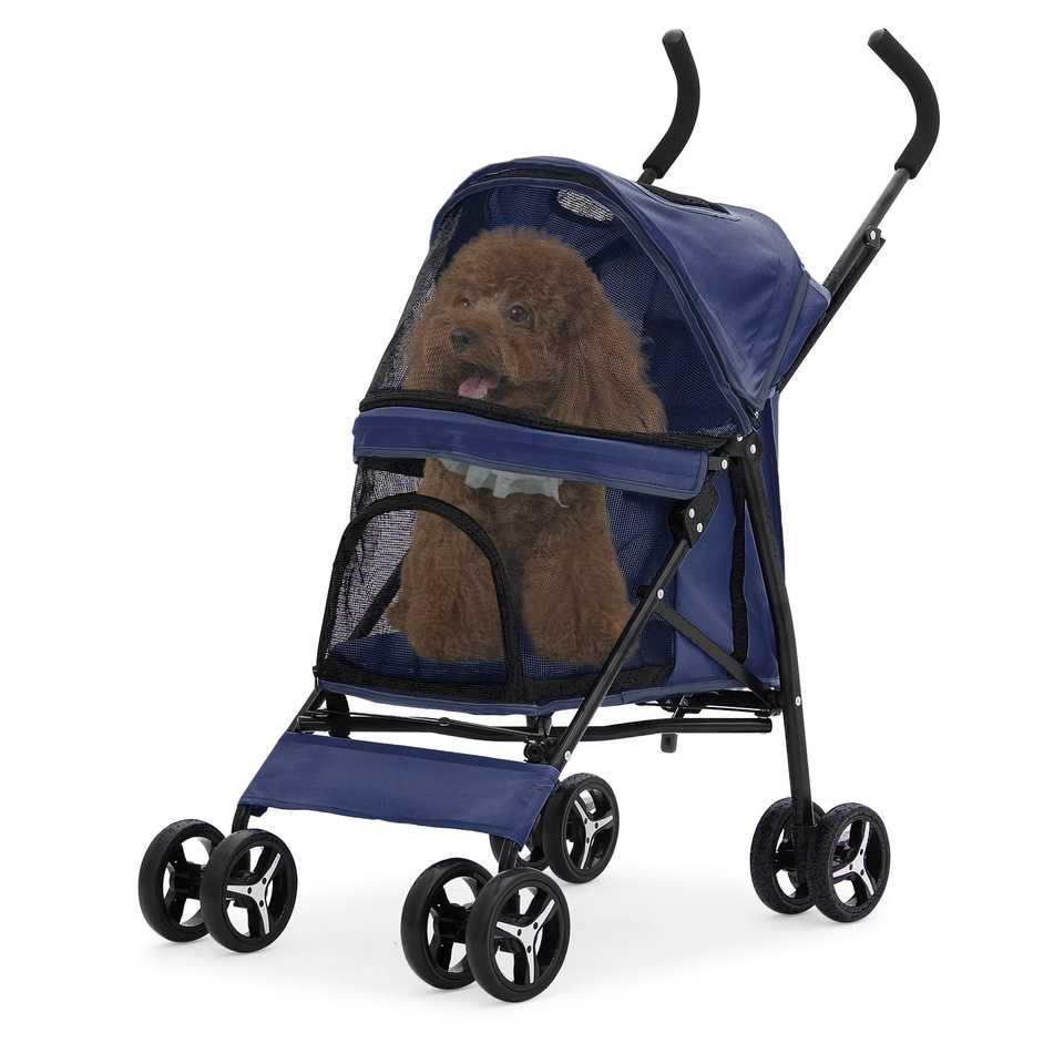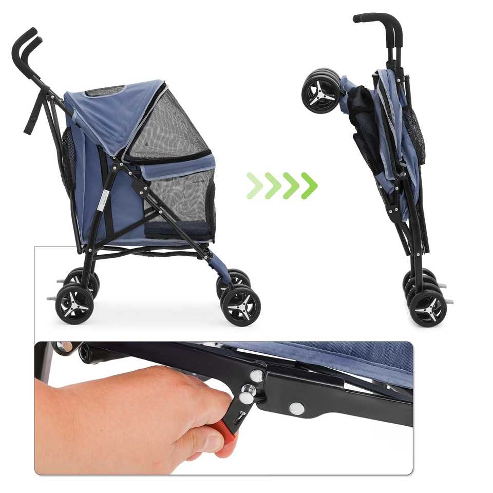 TH-PPS-578 Foldable Pet Stroller 4 Wheel Travel Dog Cat Breathable Mesh Adjustable Canopy Stainless Steel Frame